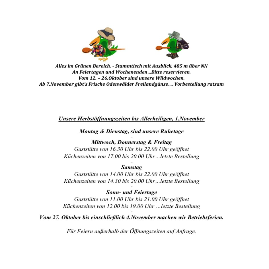 Gaststätte von 16.30 Uhr bis 22.00 Uhr geöffnet. Küchenzeiten von 17.00 Uhr letzte Bestellung 20.00 Uhr.