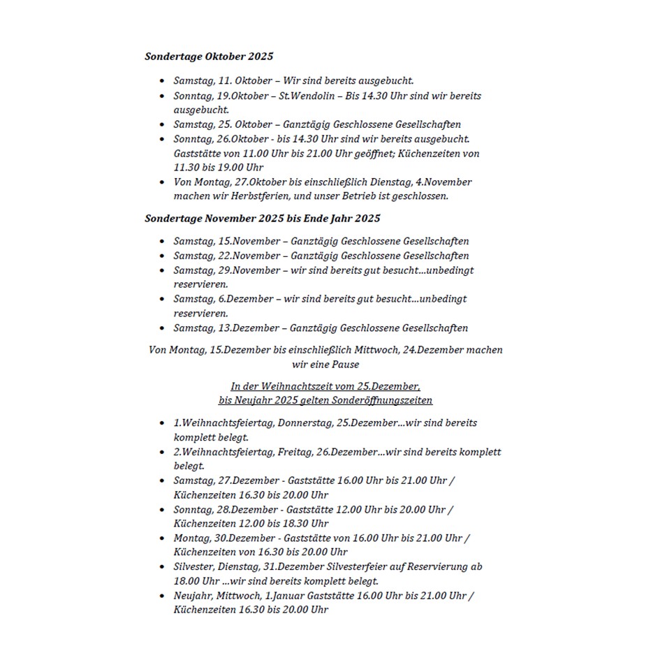 Bitte beachten Sie unserer Öffnungszeiten und Sondertage.