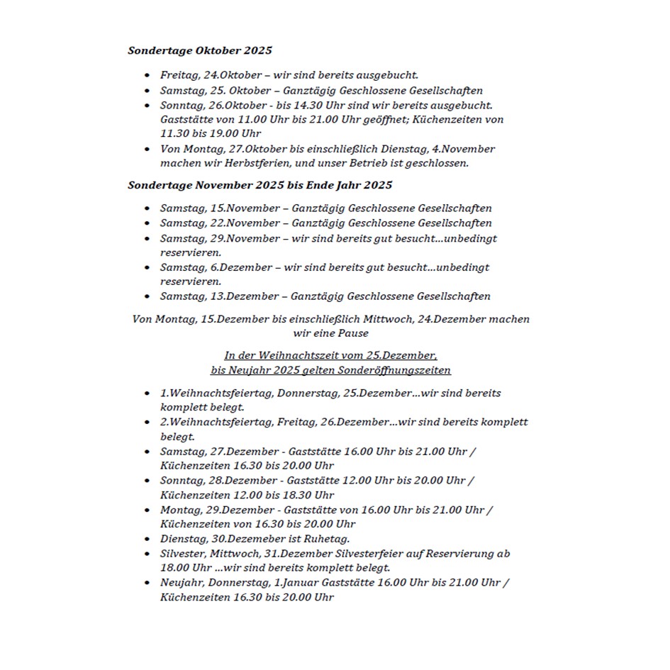 Bitte beachten Sie unserer Öffnungszeiten und Sondertage.